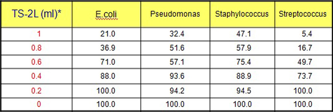 Experimental results show that the ingredient (TS-2L®) can inhibit the growth of four pathogens (E.coli, Pseudomonas, Staphylococcus and Streptococcus).